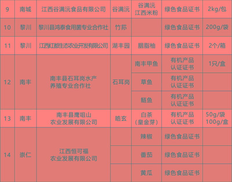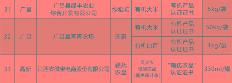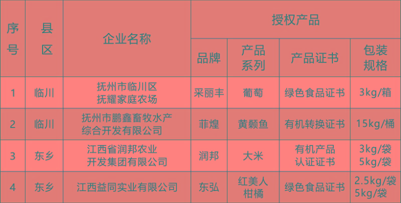 根據(jù)《撫州市生態(tài)產(chǎn)品質(zhì)量認(rèn)證結(jié)果采信試點(diǎn)實施方案》(撫府辦字【2023】30號)文件精神,按照《撫州市生態(tài)農(nóng)業(yè)協(xié)會章程》、《“贛撫農(nóng)品”區(qū)域公用品牌使用管理辦法》、《“贛撫農(nóng)品”集體商標(biāo)管理實施細(xì)則》相關(guān)規(guī)定,經(jīng)撫州市生態(tài)農(nóng)業(yè)協(xié)會組織初審、復(fù)審,最終評定2023年共33家會員主體的57個產(chǎn)品符合品牌授權(quán)標(biāo)準(zhǔn)。現(xiàn)將2023年度授權(quán)使用“贛撫農(nóng)品”區(qū)域公用品牌的產(chǎn)品名錄予以發(fā)布。